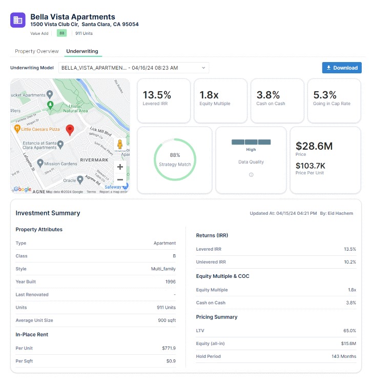 • Interactive Deal Analytics: Professionals can analyze the entire underwriting history, compare key metrics across past deals, and centralize property files for quick reference.